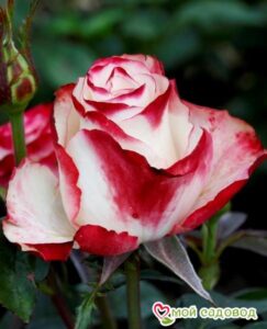 Венчики крупные, двухцветные, диаметр примерно 10 см. Распустившаяся роза имеет классическую форму, чашевидная. Цветки густомахровые и в каждом 83 лепестка. Расположены цветки в соцветиях (по 3 штуки) или одиночно.